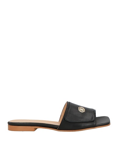 slide sandals, leather, brand logo, plain colour, leather lining, square toe, flat, rubber sole, contains non-textile parts of animal origin