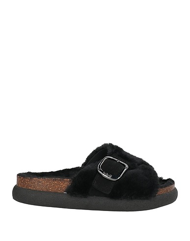 sandals, plush fabric, suede, plain colour, brand logo, fully lined, buckle fastening, round toe, flat, rubber cleated sole, contains non-textile parts of animal origin