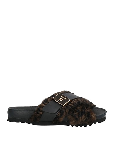 technical sandals, plush fabric, leather, animal print, brand logo, plush fabric inner, round toe, flat, rubber cleated sole, contains non-textile parts of animal origin