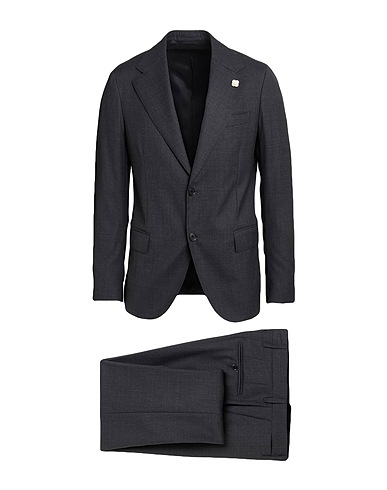 single-breasted suit, cool wool, plain colour, darts, brand logo, lapel collar, long sleeves, buttoned cuffs, fully lined, button fastenings, flap pockets, one chest pocket, dual back vents, mid rise, belt loops, dry clean, do not bleach, do not tumble dry