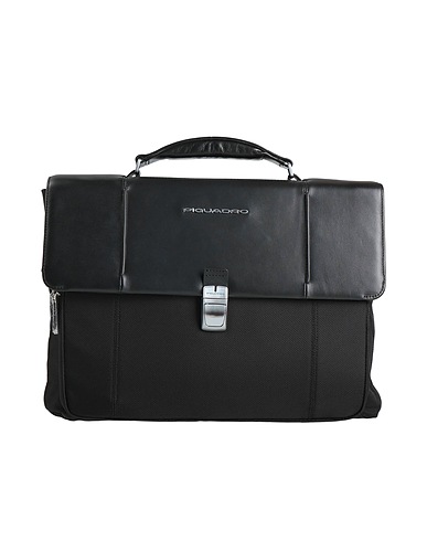 computer bag, leather, plain colour, brand logo, framed closure, external pockets, laptop compartment, bag handle, detachable shoulder strap, large size, contains non-textile parts of animal origin