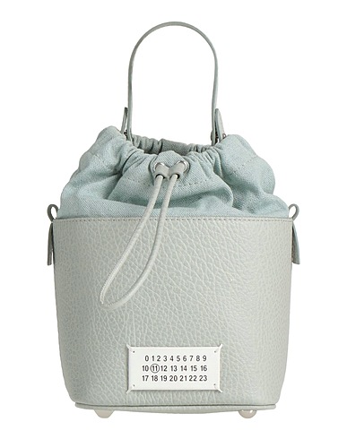 bucket bag, pebbled-leather, canvas, plain colour, brand logo, drawstring fastening, fully lined, internal pocket, detachable top handle, detachable shoulder strap, metallic straps, feet at base, small size, contains non-textile parts of animal origin