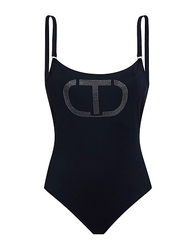 swimsuit, synthetic jersey, stretchy fabric, plain colour, crystals, brand logo, hand wash, do not bleach, do not tumble dry, do not iron