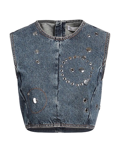 denim, faded, studs, plain colour with appliqués, medium wash, crewneck, sleeveless, zip fastening, no pockets, crop top