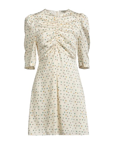 satin, frills, floral design, crew neck, 3/4 length sleeves, partially lined interior, zipper closure, no pockets, trapeze style