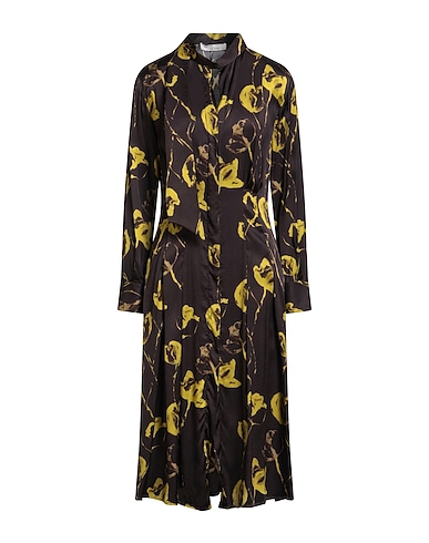 satin, brand logo, floral-print, mandarin collar, long sleeves, unlined, hidden buttons, no pockets, hand wash or dry clean, do not tumble dry, do not bleach, shirt dress