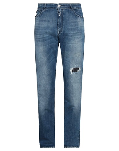 denim, faded, torn fabric, brand logo, leather applications, solid colour, medium wash, high waisted, belt loops, tapered leg, regular fit, zipper closure, 1 button, five pockets, stretch, contains non-textile parts of animal origin, straight-leg model