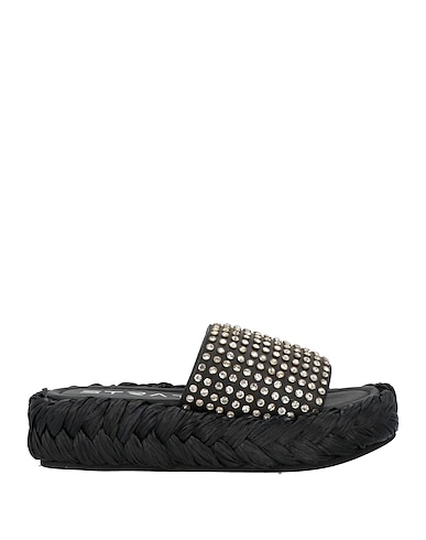 slide sandals, leather, plain colour with appliqués, crystals, leather lining, round toe, flatform, rubber sole, contains non-textile parts of animal origin