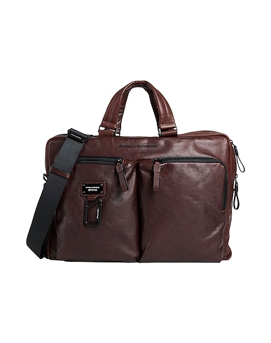computer bag, leather, plain colour, brand logo, zip fastening, fully lined, external pockets, double handle, adjustable shoulder strap, maxi size, contains non-textile parts of animal origin