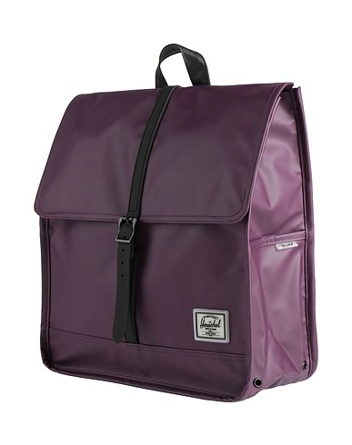 rucksack with flap, synthetic material, plain colour with appliqués, brand logo, buckle, magnetic fastening, fully lined, internal pockets, large size