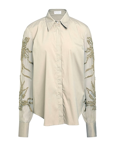 poplin, organza, embroidered, sequins, solid color with appliqués, classic collar, long sleeves, buttoned cuffs, button fastenings, no pockets, stretch, contains non-textile parts of animal origin, dry clean, do not tumble dry, do not bleach, shirt