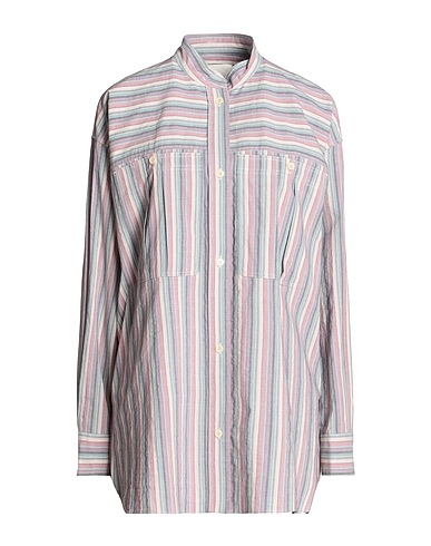 woven, no appliqués, striped, mandarin collar, long sleeves, buttoned cuffs, button fastenings, two breast pockets, side slit hemline, oversized shirt