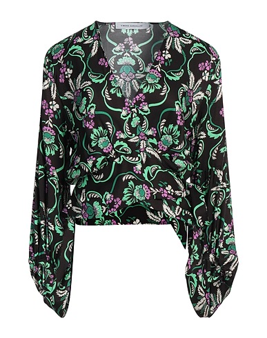 wrap top, satin, floral-print, no appliqués, deep neckline, long sleeves, tie fastening, dry clean, do not bleach, do not tumble dry