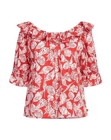 off-the-shoulder top, woven, two-tone, no appliqués, 3/4 length sleeves, machine wash, do not bleach, do not tumble dry