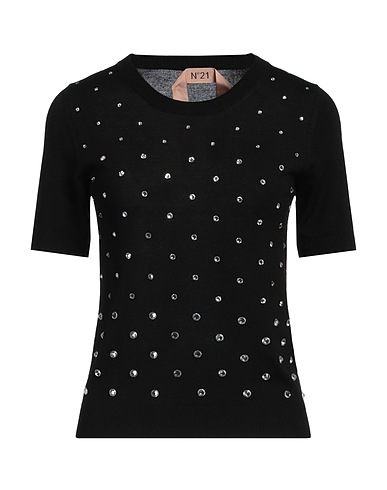 wool, lightweight knit, plain colour with appliqués, crystals, crewneck, short sleeves, hand wash, do not bleach, do not tumble dry, this brand runs large