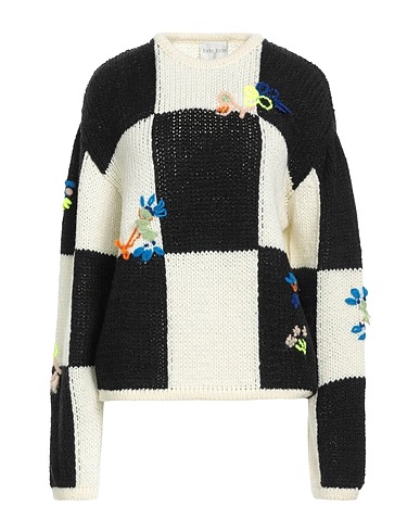 knitted, medium-weight knit, embroidered, checked, crewneck, long sleeves, without pockets, dry clean, do not bleach, do not tumble dry