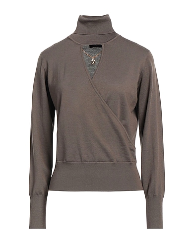 wool, lightweight knit, brand logo, wrap-effect, charms, plain colour, turtleneck, long sleeves, without pockets, hand wash or dry clean, do not bleach, do not tumble dry, this brand runs small