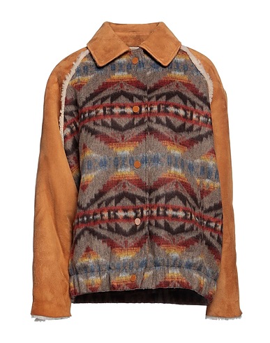 leather, baize, no appliqués, multicolour pattern, classic neckline, single-breasted , long sleeves, partially lined interior, lined in goat hair, snap buttons fastening, multipockets, contains non-textile parts of animal origin, mackintosh model