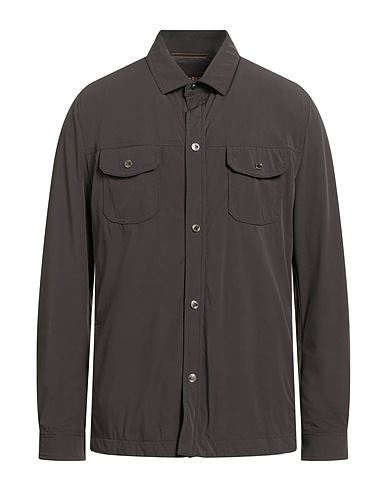 overshirt, shell, waterproof, plain colour, no appliqués, classic collar, long sleeves, fully lined, snap fastenings, two chest pockets, slit pockets, contains non-textile parts of animal origin, dry clean, do not bleach, do not tumble dry