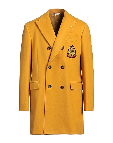 double-breasted coat, felt, brand logo, embellished, plain colour with appliqués, lapel collar, long sleeves, fully lined, rear slit, dry clean, do not bleach, do not tumble dry