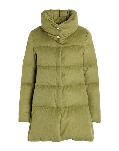 down coat, flannel, plain colour, no appliqués, turtleneck, long sleeves, goose down interior, snap fastenings, multipockets, contains non-textile parts of animal origin, dry clean, do not bleach, do not tumble dry