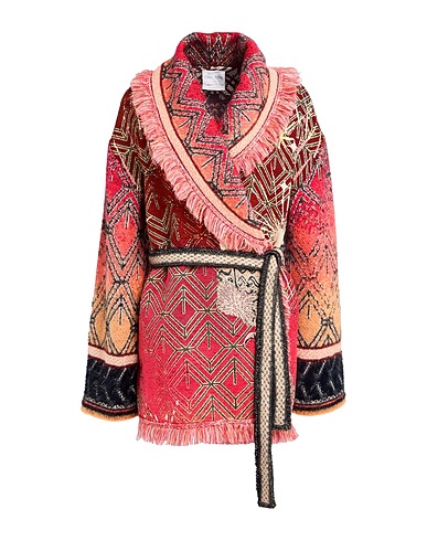 belted coat, jacquard-knit, mid-weight knit, belt, metallic trim, multicolour, single-breasted , long sleeves, unlined, pockets, fringed hem, dry clean, do not bleach, do not tumble dry