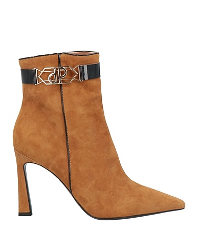 ankle boots, suede, plain colour with appliqués, logo-embellished, patent-leather trims, zip fastening, pointed toe, geometric heel, leather lining, leather sole, contains non-textile parts of animal origin