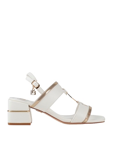 coated fabric, brand logo, two-tone, fully lined, buckle fastening, square toeline, square heel, covered heel, rubber cleated sole, ankle strap sandals
