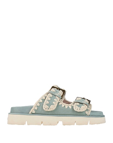 sandals, suede, plain colour with appliqués, brand logo, knitted trims, leather lining, buckle fastening, round toe, flat, rubber sole, contains non-textile parts of animal origin