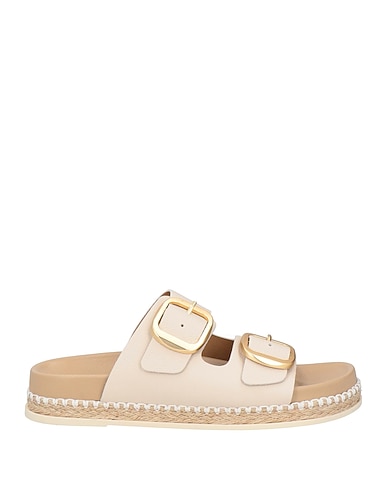 espadrille sandals, pebbled-leather, plain colour, no appliqués, leather lining, buckle fastening, round toe, flat, rubber sole, contains non-textile parts of animal origin