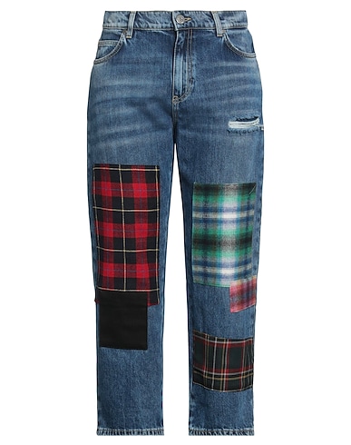 boyfriend jeans, denim, distressed, plain colour with appliqués, brand logo, patches, medium wash, high waisted, belt loops, regular fit, button fastenings, zip fastening, multipockets, dry clean, do not bleach, do not tumble dry