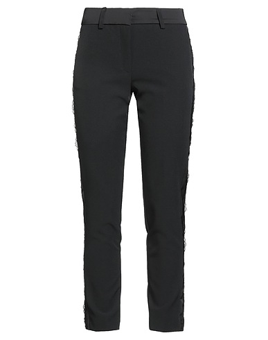 tapered trousers, crepe, plain colour with appliqués, lace trims, mid rise, belt loops, regular fit, zip fastening, hook fastenings, slit pockets, faux pockets, stretch, hand wash, do not bleach, do not tumble dry