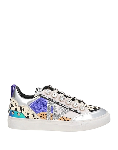 low-top trainers, leather, calf hair, metallic, animal print, brand logo, studs, leather lining, lace-up, round toe, rubber cleated sole, contains non-textile parts of animal origin