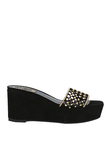 slide sandals, suede, crystals, cutout, plain colour with appliqués, leather lining, square toe, wedge heel, rubber sole, contains non-textile parts of animal origin