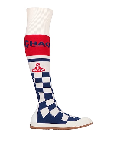 boots, knitted, checked, brand logo, fabric inner, round toe, flat, rubber sole