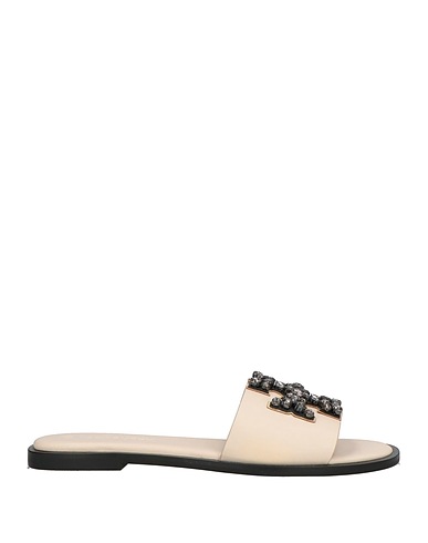 slide sandals, leather, plain colour with appliqués, brand logo, beads, leather lining, round toe, flat, rubber cleated sole, contains non-textile parts of animal origin, large sized