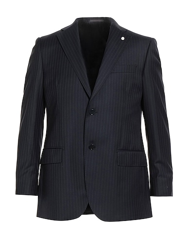 single-breasted blazer, cool wool, pinstriped, brooch, lapel collar, long sleeves, fully lined, button fastenings, flap pockets, one chest pocket, dual back vents, dry clean, do not bleach, do not tumble dry