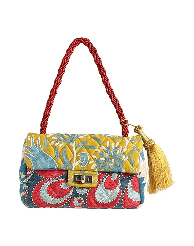 flap bag, woven, multicolour, embroidered, combination lock fastening, leather lining, bag handle, medium size