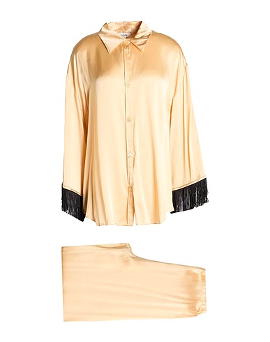 pyjama pant set, satin, plain colour with appliqués, fringes, classic collar, long sleeves, button fastenings, drawstring fastening, do not bleach, hand wash, do not tumble dry