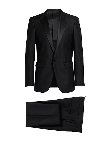single-breasted suit, cool wool, plain colour, satin trims, lapel collar, long sleeves, fully lined, button fastenings, flap pockets, one chest pocket, rear slit, high waisted, contains non-textile parts of animal origin, dry clean, do not bleach, do not tumble dry, get your look right with this designer outfit, suited for business meetings or special occasions