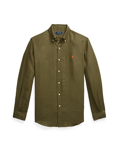 slim-fit shirt, linen, plain colour, embroidered logo, button-down collar, long sleeves, buttoned cuffs, button fastenings, machine wash or dry clean, tumble dry, this brand runs large