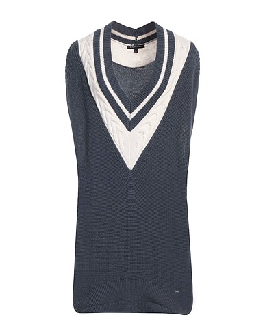 knitted, cable-knit, ribbed, medium-weight knit, two-tone, brand logo, v-neck, sleeveless, hand wash, do not bleach, do not tumble dry