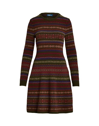 flared dress, knitted, jacquard, medium-weight knit, multicolour, no appliqués, crewneck, long sleeves, unlined, machine wash or dry clean, do not tumble dry