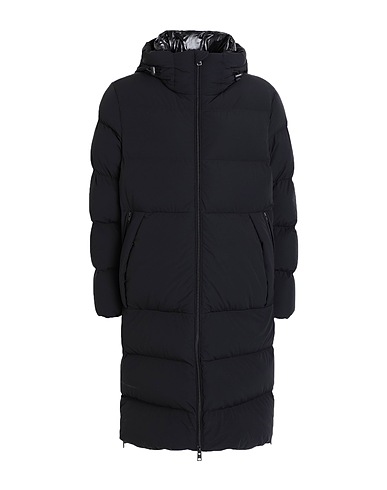 down coat, shell, stretchy fabric, brand logo, plain colour, hooded, long sleeves, duck down filling, heavyweight padding, zip fastening, zipped pockets, contains non-textile parts of animal origin, machine wash or dry clean, do not bleach, do not tumble dry, this item contains down or feather sourced from farms where animal welfare is valued
