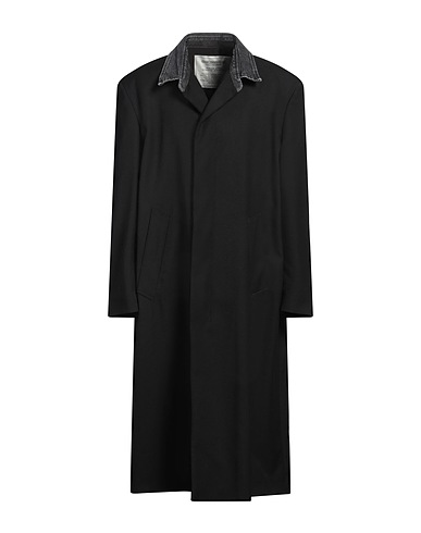 single-breasted coat, twill, denim, two-tone, no appliqués, camp collar, long sleeves, fully lined, concealed button fastenings, welt pockets, rear slit, dry clean, do not bleach, do not tumble dry