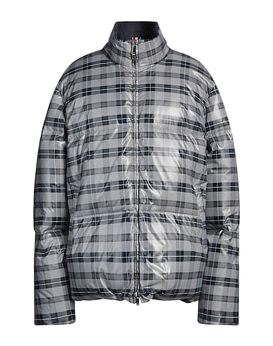 down jacket, shell, tartan pattern, brand logo, turtleneck, single-breasted , long sleeves, goose down interior, double face, contains non-textile parts of animal origin, dry clean, do not bleach, do not tumble dry