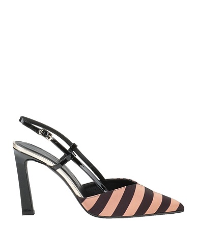 satin, leather, varnished effect, no appliqués, striped, two-tone, leather backing, buckling ankle strap closure, narrow toeline, stiletto heel, rubber sole, contains non-textile parts of animal origin, slingback courts