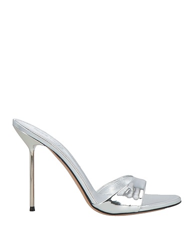 leather, laminated effect, no appliqués, plain colour, leather backing, round toeline, spike heel, leather sole, contains non-textile parts of animal origin, slide sandals