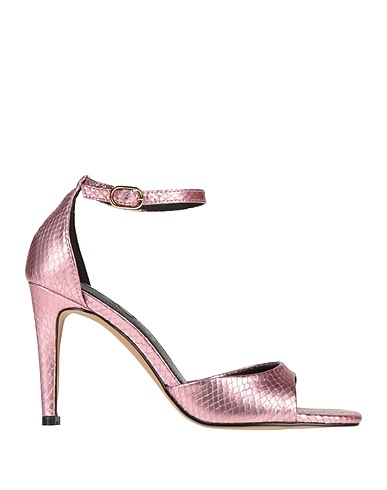coated fabric, snakeskin print, laminated effect, no appliqués, plain colour, leather lining, buckling ankle strap closure, square toeline, stiletto heel, covered heel, rubber sole, contains non-textile parts of animal origin, ankle strap sandals