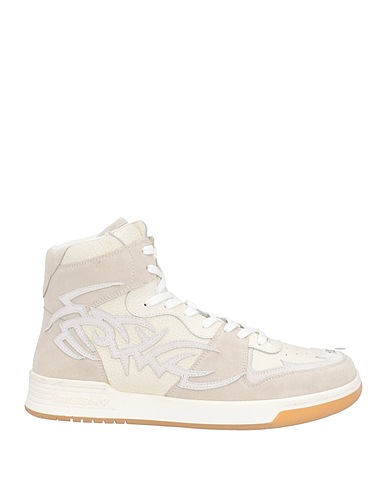 leather, brand logo, plain colour, leather lining, laces, round toeline, flat, rubber cleated sole, contains non-textile parts of animal origin, high-top trainers